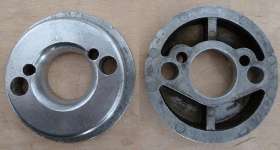 Pictures here show the K&N stub stack installed on the MGA air cleaner back plate. The part is rotated about 90 degrees and is attached with two pop rivets at the extreme ends of the flange. The issues here, as noted on the prior page, are a poor quality part, rough finish, mismatched throat diameter, minimal inlet radius, and sharp cornet at the inlet end. This led to some lively discussion on The MG Enthusiasts' BBS as to what might be an optimal shape for the air inlet. See next page.