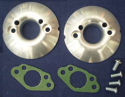 Meanwhile these similar parts were offered on eBay by a seller named "turner.carbs" (Andrew Turner) for £49.95/set (plus shipping). They feature "a 7 degree exponential full flare" and are 13mm deep. The small notches at the edges are likely intended to clear the wider spaced posts in the MGB air filter housings. This may require a bit of fettling to make them fit in the MGA air cleaners. Increased thickness is not good inside of a shallow side entry air cleaner, although there is so far no basis for comparison.