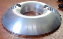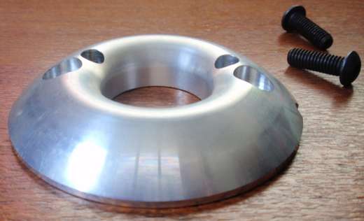 This one is offered by Rimmer Brothers (Part number 01FD23ALO1). They measure 16mm thick, and 100mm diameter. Despite being aluminum they are surprisingly weighty. Having seen this picture, I'm inclined to believe the 7 degree angle may refer to the ramp angle inboard from the top ridge, as the outer ramp appears to be much steeper. The rim at the base is 3mm thick. This part may work okay inside of the deeper MGB filter housings. For the shallower Volkes filters on MGA this part may work better if you shave the back side to reduce the thickness to about 8-mm (5/16-in). That may lose about 2/3 of the weight in the process. The extra thickness is obviously a hindrance. There is likely little or no benefit in the length of the cylindrical throat. Smaller OD and slight difference in ramp angle may be nearly insignificant. A final sharp edge on the OD may be a good thing.