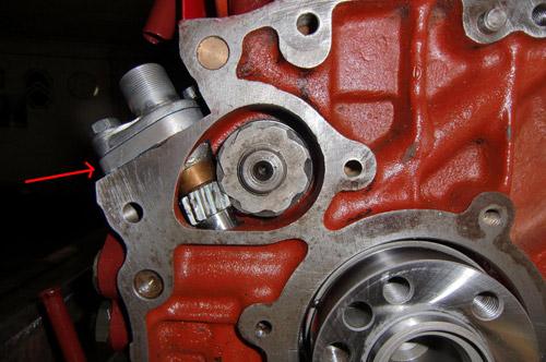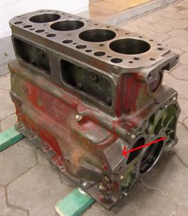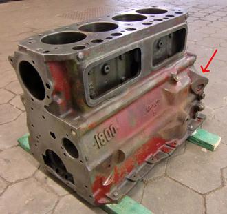 These photos provided by Manfred Jaeger in Germany. It is an MBG 1800 5-main bearing engine block being machined for addition of mechanical tachometer drive. It must be machined in the area noted by the red arrows. At one point low at the rear there is insufficient material to provide a complete mounting surface for the tachometer drive housing. So it was machined a little deeper, followed by addition of a thick spacer plate for correct positin of the tach drive housing (then needing two paper gaskets). This is the first time I have seen a 5-main bearing block successfully machined for the tach drive.