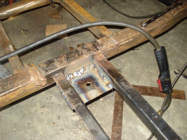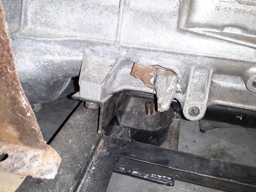 To accommodate the T-5 transmission mounts, I welded a steel plate across the two center rails of the floorboard structure, welded up a mount bracket, and used my old favorite simple biscuit-type rubber mount.