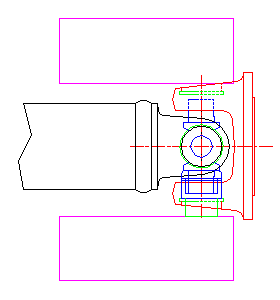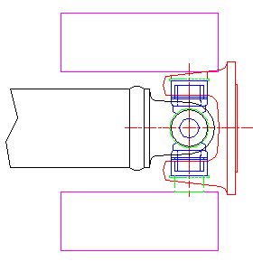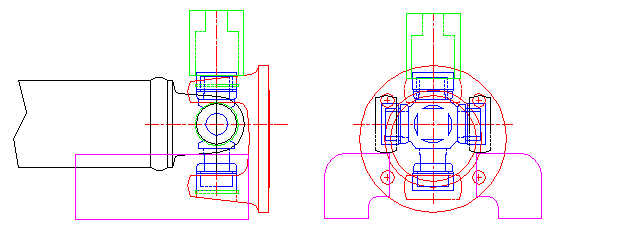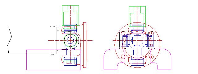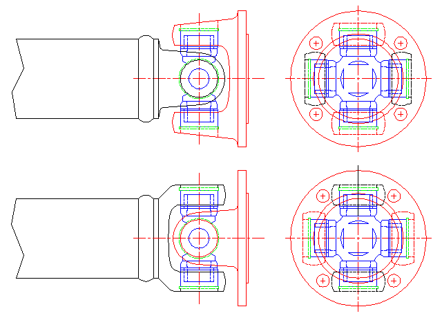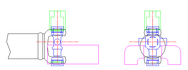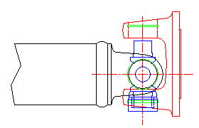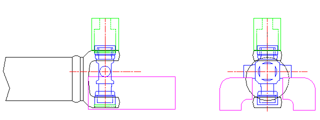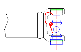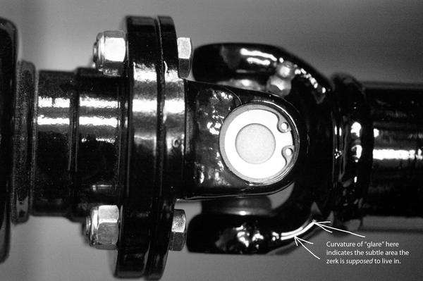 One important detail here. Note the heavy (red) marks in the image above right. There is an indented notch in the fixed yoke to provide clearance for the grease fitting. The spider must be aligned properly to place the tapped grease port in the same position (as shown). If you get this wrong the grease fitting cannot be installed, or the grease gun nozzle will not fit on the grease fitting. See incorrect positioning at right.
