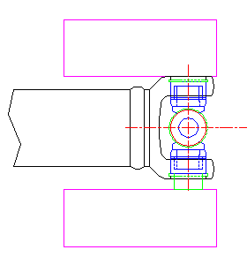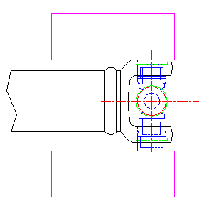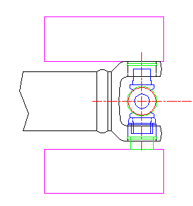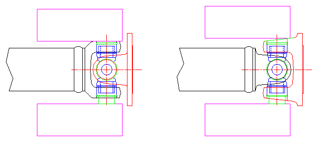 Above is a diagram of the assembled universal joint. Piece parts begin with a fixed yoke welded to the propshaft (providing the fixed axis), an articulated yoke mounted on the free axis, a cross spider with four small bearing journals, four bearing caps with full compliment needle roller bearings inside packed with grease, four snap rings, and the grease fitting to finish it off (more on that later).