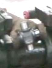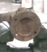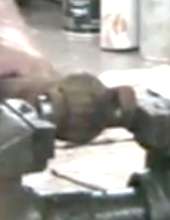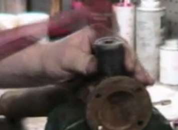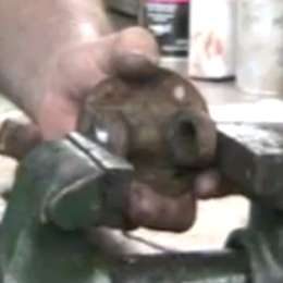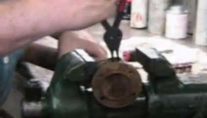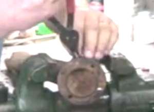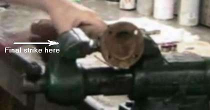 Operation for the fixed yoke is similar. Adjust vice to lay the two exposed journals of the spider on the jaws. Place the large socket on the yoke surrounding the bearing cap, and strike the socket to drive the yoke downward to raise the cap partially out of the yoke.