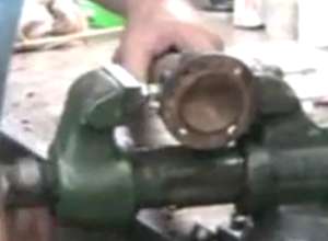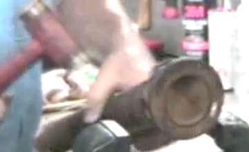 Invert the propshaft and repeat the same operation on the opposite end of the free axis, raising the second bearing cap partially out of the yoke. At this point you need to grip the exposed end of the bearing cap in the vice and tap the side of the weld joint to extract the bearing cap from the yoke, both sides. Then the free yoke can be removed from the remaining spider.