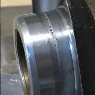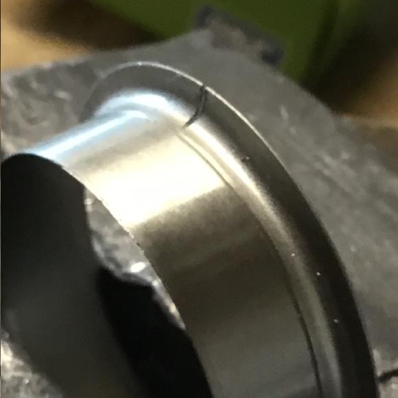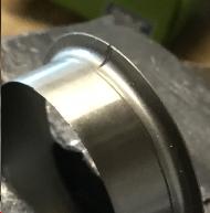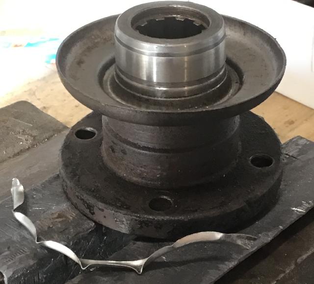 Judging by the circle of pitting and geometry of the sleeve, I decided to follow Instruction 6 and remove the sleeve flange after fitting. Instruction 6 is not clear on how deep the cut in the flange should be and I stopped it at the tangent point of the sleeve to flange radius fearing that if I cut deeper the flange would break off during driving in to position, fifth picture.