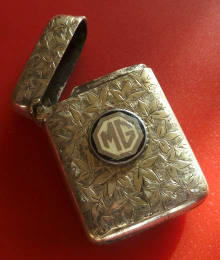 "VINTAGE SILVER PLATED VESTA MATCH CASE MG BADGE -- A silver plated Vesta case from the classic 50s/60s era. It has an engraved leaf pattern together with an enameled MG badge on the front. It measures 2" x 1 1/2" It is in excellent condition".