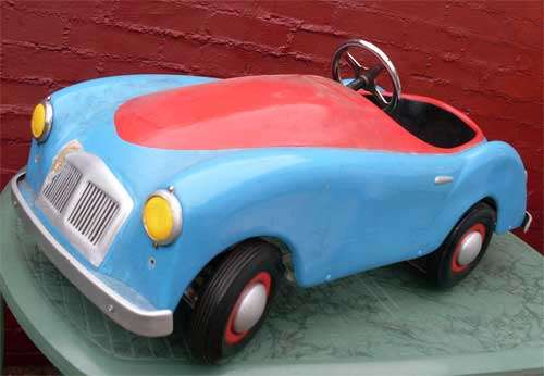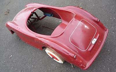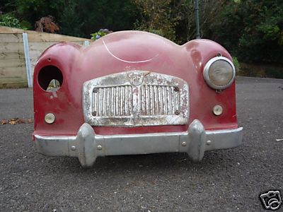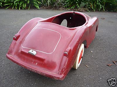 The blue one was recently purchased by Vaugh Cooper in the UK. It was made by Tri-ang in Australia, but there doesn't seem to be a source for spare parts. Who can help? The one below is fiberglass, has a batttery tray, and looks like it should have working headlights.