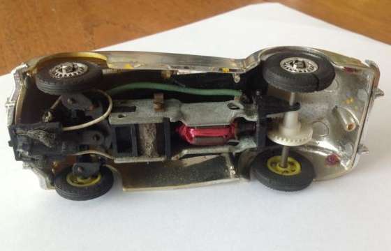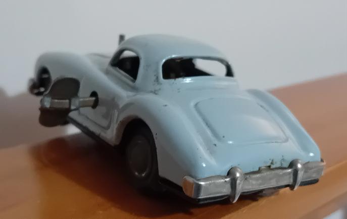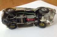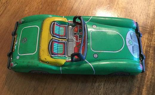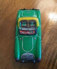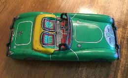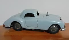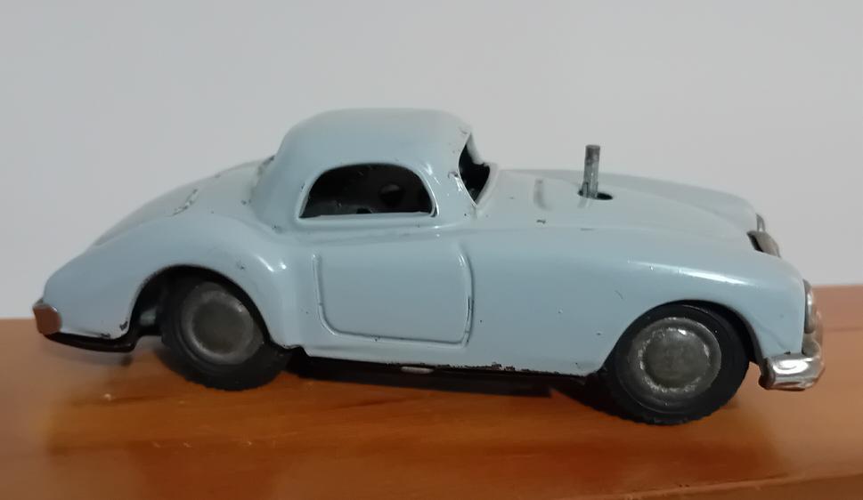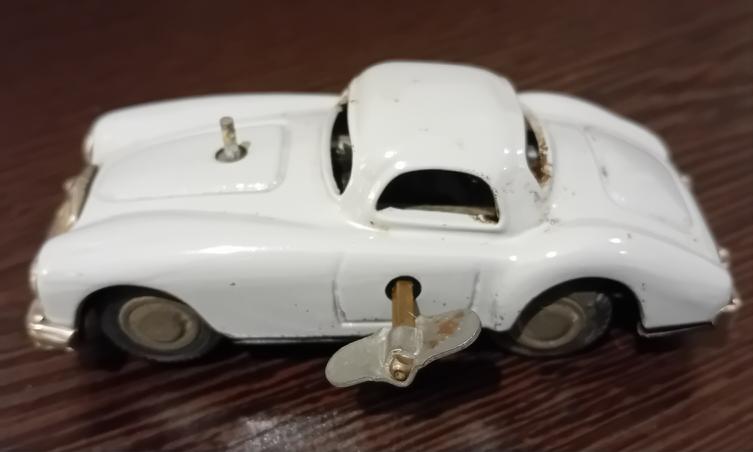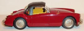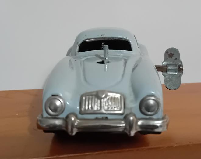 "I bought in an antique shop this week what looks very like my MGA Coupe. It is a windup/clockwork model car and there is a red wheel on the underside which makes me think it was designed to run on some kind of track. No makers mark anywhere except 'made in Japan'. It does go when wound up".