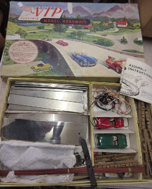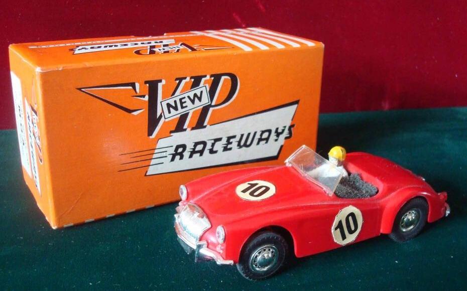 How about VIP Roadway slot cars from the late 1950s. This set included a BRG MGA and a red Healey. The "VIP Model Roadway" slot cars are a bit larger scale than current Scalextric slot cars but could still be used on current Scalextric type track. They were very well made for the era, and can be found still on eBay, often in fine condition. They look great in a display cabinet!