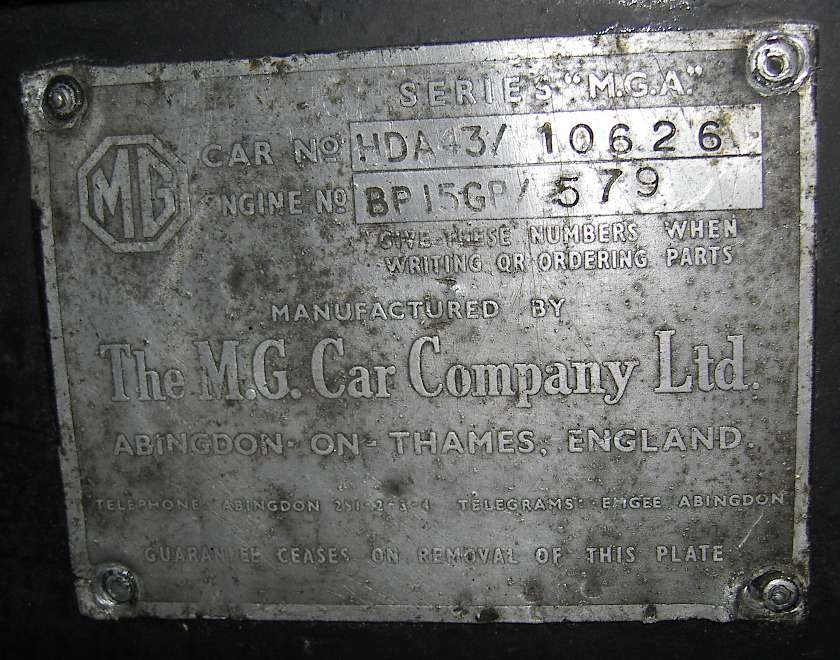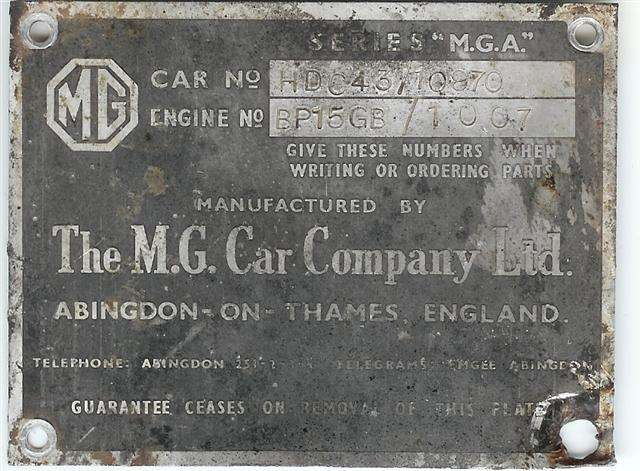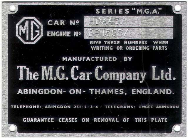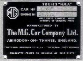 As of late 2011, Serge Vliegen in Belgium is producing another version of the early MGA 1500 plate with the word "Guarantee" to suit the small number of early MGA owners who want the best for concours show. See photo at right. Click for larger image. For ordering information go to: