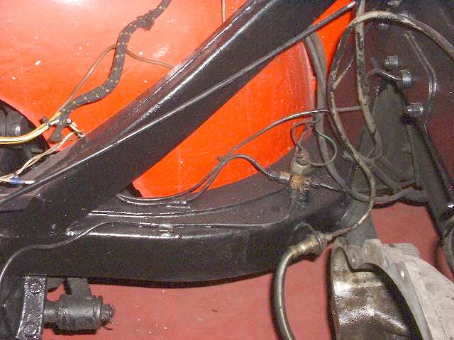 4049.jpg (on right here) - RF brake pipe running above right side of frame to hose anchor bracket. More tie wraps for my rally sensor cable. Pipe end fitting and mating hose end will be different for the 1600 model with disc brakes. The hose anchor bracket is also in a little different position for the 1600.