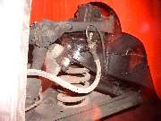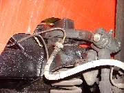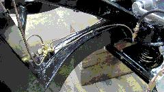 4043.jpg - Connections to 5-way block on top of frame. The outboard port is the line from master cylinder. Front port goes to RF wheel. Inboard port goes to LF wheel. Rear port is the pipe running under frame to back of car. Notice bend down welded tabs on top of frame securing the front brake pipes. The black wiring cable attched to RF pipe with a tie wrap is the (non-standard) cable for the hall effect sensor on the RF hub sending wheel rotation signals to my rally computer. The clutch pipe and hose are also visible in this picture.