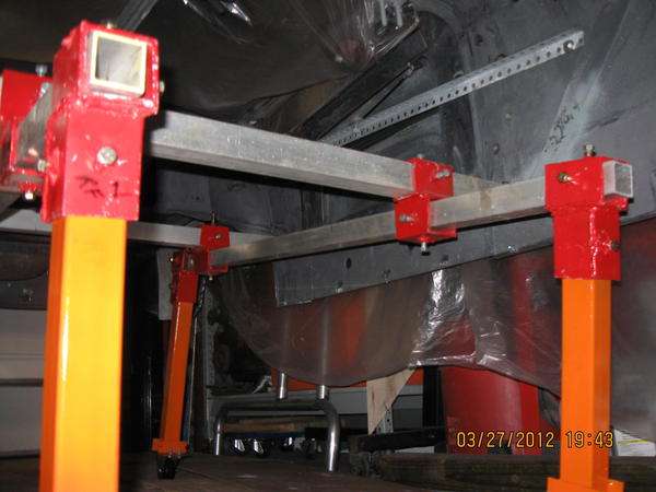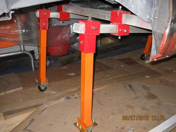"I built a dolly out of Aluminium Tubing. The tubing is attached to the 4 main Frame bolt hole points on the body. The tubing is then attached to other tubing using steel collers I welded together".