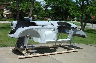 This one is my own spur of the moment creation, done during my third repaint and 2nd restoration of the same car. When I was replacing body sills the body was still bolted to the frame as the alignment and welding jig. When the body came off the frame it would sit on a pair of cheap collapsible saw horses for easy access to everything underneath during final weld cleanup and outer body panel repair and fitting.
