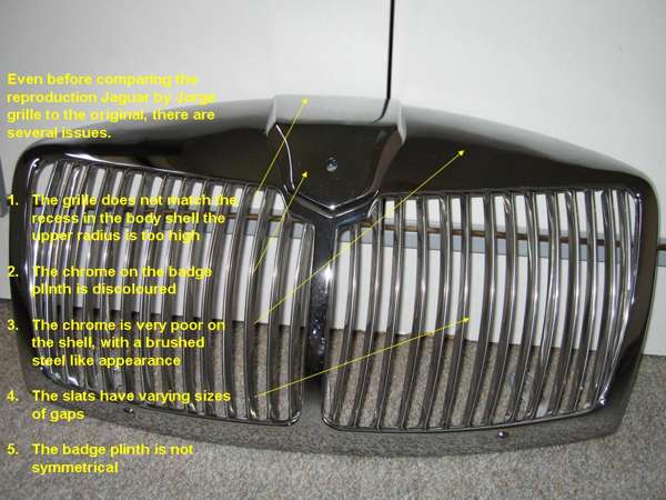 "I have just received my grille from Jaguar by Jorge. I am terribly disappointed. The grille is far away from the original shape and the quality is absolutely appalling. The chrome finish has grinding/polishing lines throughout the surface, having an almost "brushed steel" like appearance in many places. The back of the grille is completely painted with a poor quality silver paint that comes off on ones fingers when touched. The surface was not cleaned prior to painting and has all kinds of contamination under the paint - including surface rust!