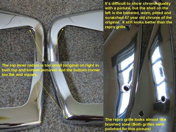 "So in summary, it doesn't fit or match the body, it is a different shape to the original, with incorrect slats, it appears to be poorly made and it has a very poor quality chrome finish. This is in total contradiction with the advertising and looks nothing like the one pictured. That one looks like the original shape".
