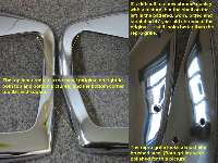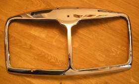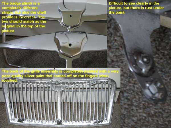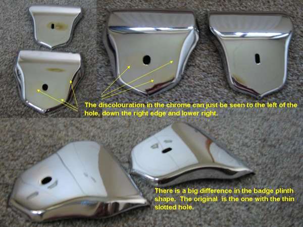 "The badge plinth itself has not been chromed properly and has large "yellow" patches. It is also, very surprisingly, far from symmetrical in shape! Additionally, it does not have the same profile as the surround and consequently there are gaps at the bottom and sides.