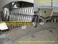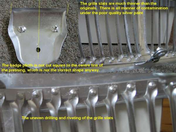 "The grille part itself is awfully made. The aluminum bar to which the slats are riveted has been drilled in an amazingly haphazard fashion. Consequently the distances between slats are not consistent. The slats themselves are considerably narrower than the originals, giving much larger (and uneven) gaps in between.