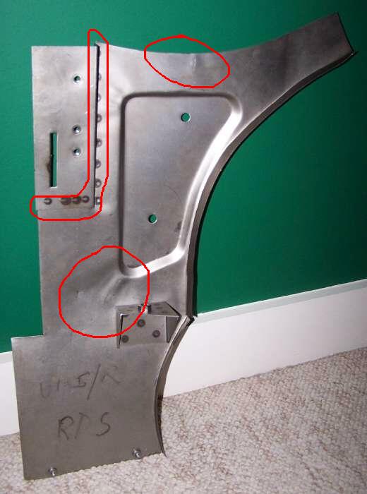 Notice wrinkles in the metal surrounding the large central depression, This area was perfectly flat on original factory parts. Also notice the spot welded insert at front top corner. For original factory panels this was all one formed piece with no welding in this area. It could be this is no functional problem if you don't mind the appearance of the wrinkles and spot welds. The welded lap joint may be hard to paint and seal and might promote future rust.