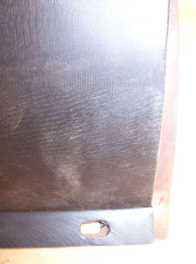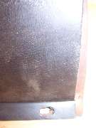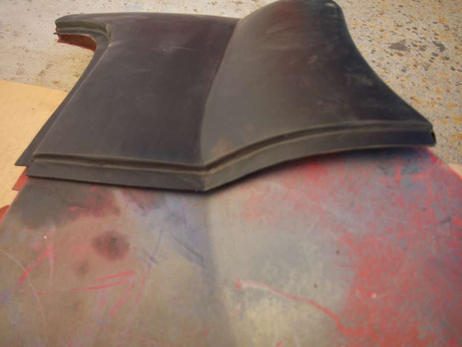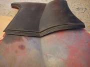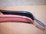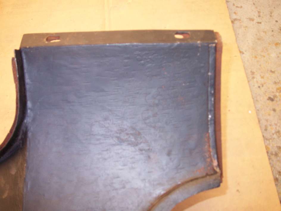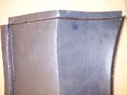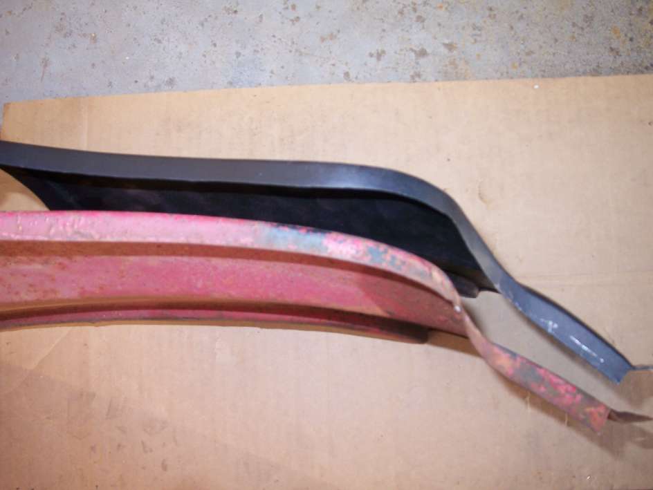 "Here are some comparison shots of original fender vs. the repair section. This is a 12" repair dog leg panel from Jorge Cervera, good gauge steel, dimensionally better than many, although too short by about 1/4" along the vertical front seam where it joins the rocker panel. The other shortcomings are wrong curvature where it joins the outer wheel arch. This is VERY difficult to correct for the amateur. It is a compound curve which also has the 90 degree edge needing to be re-curved if it is to look right when on the car, plus the very deep step where it joins the fender. Since the orig metal is substantially thinner, it follows that the step most will need lashings of bondo to blend in the joint. I believe to fit properly the step should be discarded and the joint butt welded.