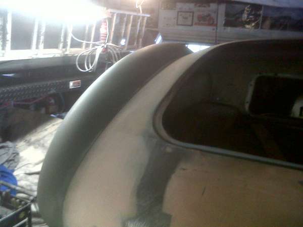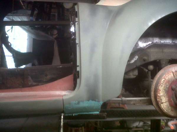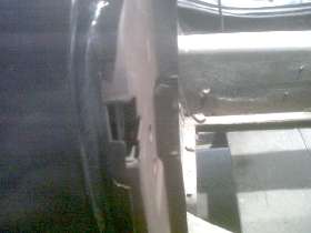 First, unlike the left side fender that had a number of smaller depressions where it meets the body, the right side had one bigger low spot of about 5/8 of an inch and about 15 inches long where it meets the body. Also, unlike the left side, the cut out for one of the door bumpers is way off (probably almost an inch). Not sure yet how the dog leg will match up, but notably, the metal where is meets the rocker is not folded over as it needs to be, and instead there is about a 1/2 inch lip at a 90 degree angle that needs to be folded over so the dog leg lays flat against the rocker".