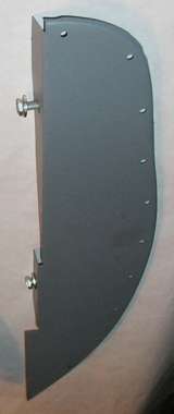 Splash panel in front of the rear wheel. This one from Moss Motors has the wide bolt flanges inboard and the narrow seal flanges around the outer edge. However, the bottom end is flat, not bent or formed to fit the curve of the inner fender flange. That will be a bit of metal forming left to the installer. Otherwise no word yet on how well it may fit.