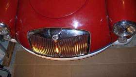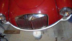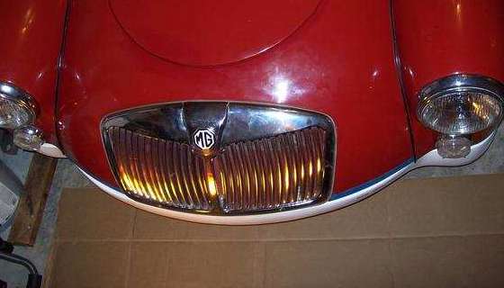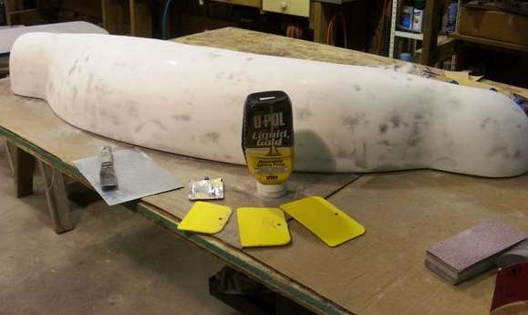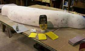 "I've had the Moss valance sitting on my workbench since last year. I had planned to bolt it on from the front, using springs behind to set the adjustment. But even with that, and shaving the top flange, it fit very poorly. I got that foam insulation spray that's used to fill holes and gaps in home construction. With the valance fitted on the car, and plenty of painter's tape to protect the paint, I used the foam to build up the low areas, both on the front of the valance and on the top, where there was a gap that I could not overcome. When the foam stuff dried, and with the valance still mounted to the car, I shaped the foam with a bread knife so that the contour of the foamed valance matched the contour of the car. Then I took it off and fiberglassed over the foam. I smoothed it up with a rasp and sanding and then used a fiberglass resin jelly to smooth".