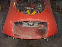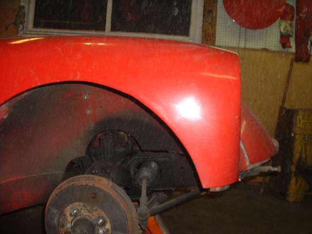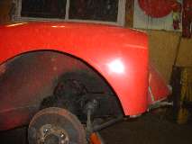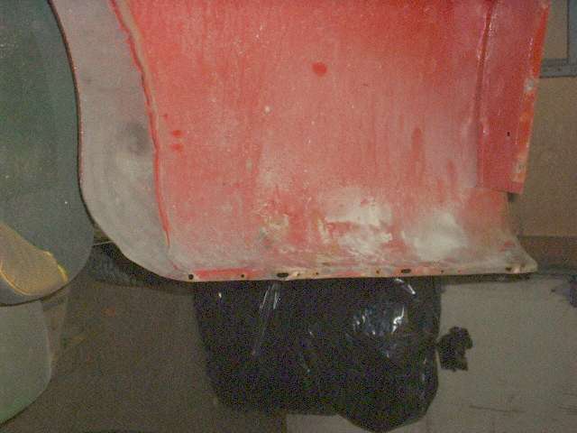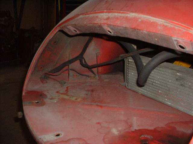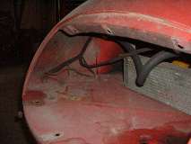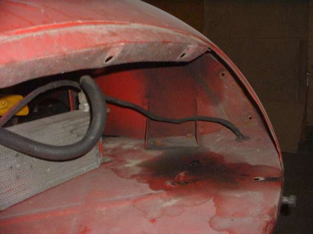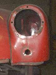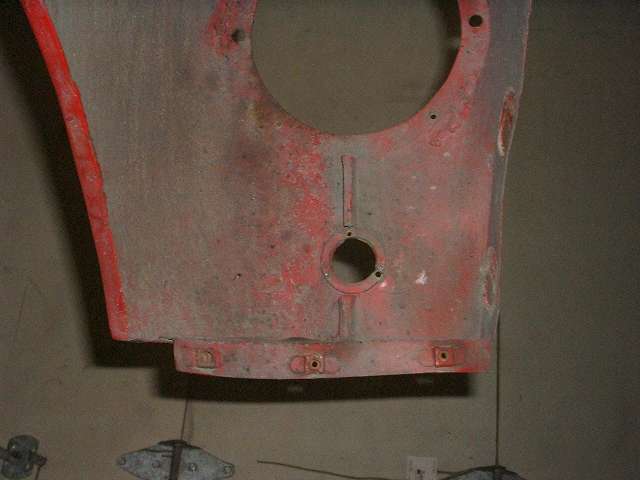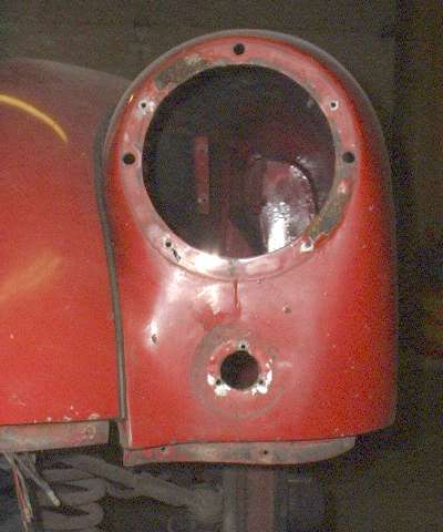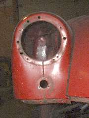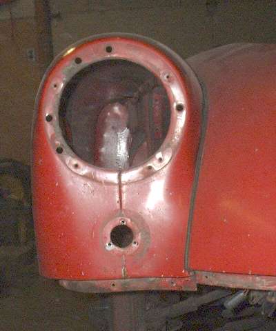 Views inside the nose of the front wings. On the right side notice the original small flange around the inside of the headlight opening. On the left side is the heavy steel ring welded in 30 years ago. I'm still amazed how well I did as an amateur (with acetylene torch).