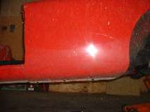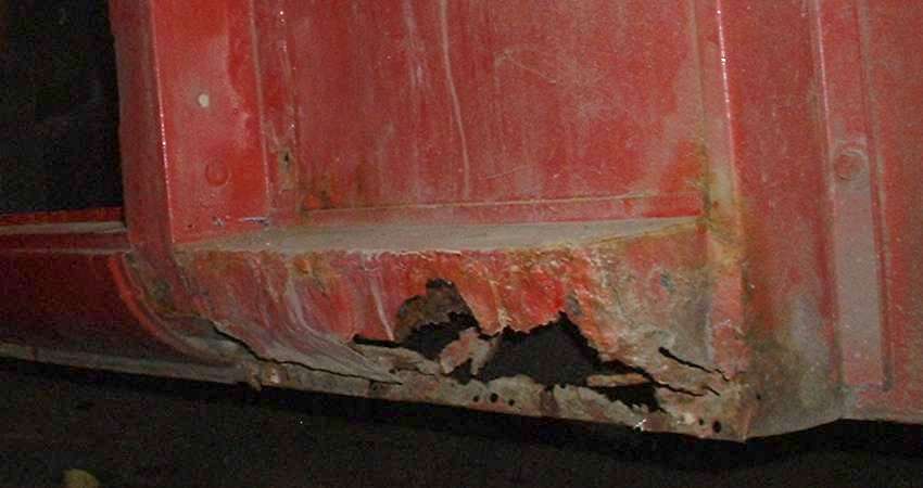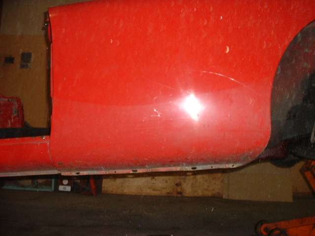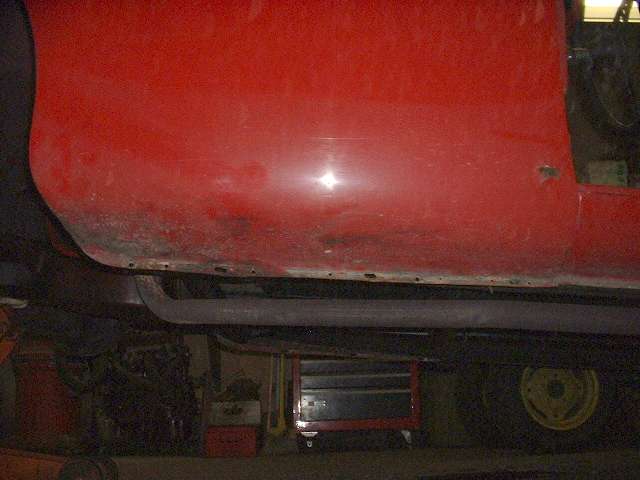 Bottom edge is in generally good condition, considering some paint abrasion just behind the tire. A small rust spot at the rear near top edge of the rocker panel is surface rust from an early paint chip.