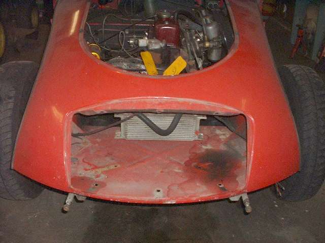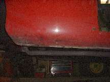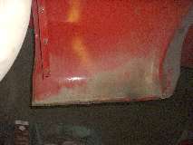 Above are views of the front end in excellent condition. The dark stains are a bit of penetrating oil from careful removal of the grill. You would never know I did a repair on this 30 years ago. There was a large "push" on the RF corner (left in this picture) that was bondoed over when I bought it. I had to pull the corner forward 1-1/2-inches to restore the original shape. The metal around the top corner of the grill opening also had to be pulled out about 1/2-inch, and a large vertical crack above the corner was welded. There is an area about the size of one hand around that corner of the opening that I lead filled about 1/8-inch deep at the thickest point. Today I could do a better job of raising the sheet metal for less fill requirement, but the job was not bad for my amateur years, it is holding up very well now, and I think I will leave it alone.