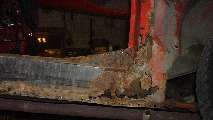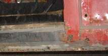 The tougher bullet to bite is the sad condition of the B pillar. This is badly eaten away for several inches at the bottom and even farther up the rear outer corner. This box section is composed of front and rear plates with flanges, and a flat outer strip. I believe the cage nuts for the shut face screws are part of the flange on the front plate. The front plate also has an indent surface in the area of the striker plate. Fortunately that area is in very good condition, and I am sure it can be saved. I think will start by removing a large part of the flat strip at least half way up the pillar. That will give me a good look inside to figure out how much of the front and back plates may have to be replaced. It may also give enough access to sand blast the inside of the pillar the rest of the way up in the part I want to keep.