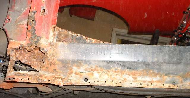 Views of the inner sill on the right side. At first glance it appears to be in slightly better condition then the left side, but perhaps the damage is just in different places. Everything underneath ahead of the A pillar is toast, although the A pillar itself is in great shape including all bottom flanges. Most of the tail end is missing. Only a few inches of the bottom of the B pillar is damaged on the outer surface, but there is more rust through higher up in back, so it may need most of the back side replaced. I may get better pictures of the B pillars soon. (13 Dec 07)