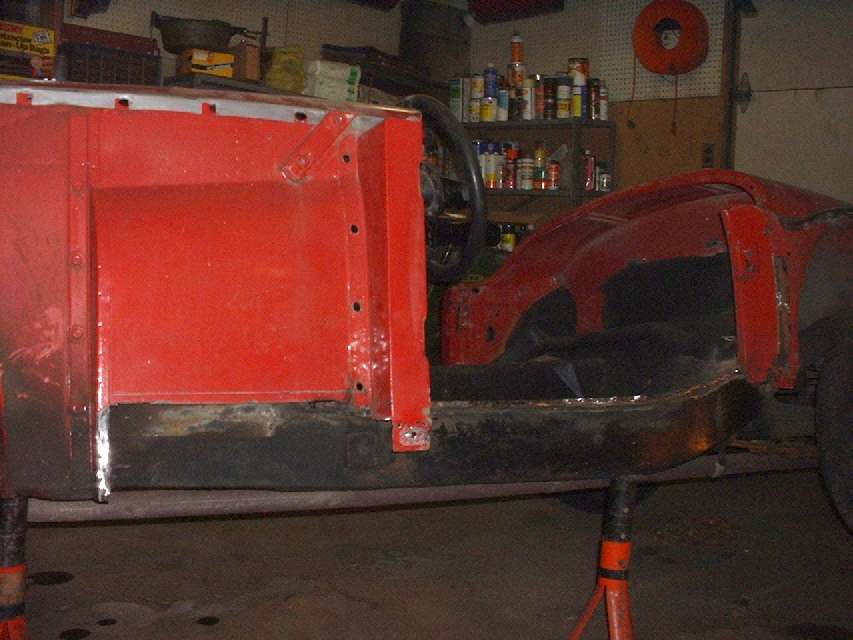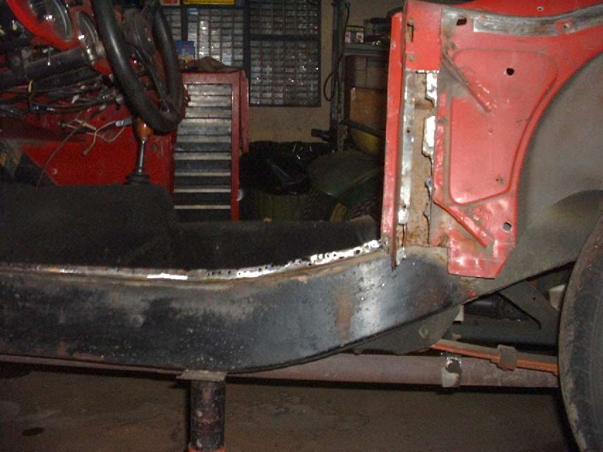 There is a lesson here about periodic maintenance. When the car was only 20 years old and still in fairly good condition it had a body off stripping to bare metal and good repaint inside and out. After a nine year layover during restoration it has done another 21 years on the road, and now it is getting some more timely "periodic maintenance" with new body sills. It is amazing how much better this car looks already without the rusted sills, and it still looks pretty much like a car. Thinking about the condition of a lot of cars that have had no underbody maintenance since they left the factory, this one looks like a restorer's dream with all of the original sheet metal from the cut lines up. The progress is motivating, so I am anxious to start putting back some new sheet metal. If I can manage to do some painting inside of the box sections this time, this car might last another 50 years (with proper maintenance), hopefully still in daily use on the road. (21 Dec 07)