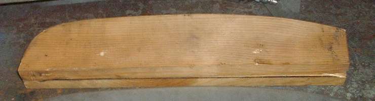 The original cardboard piece was traced from my slightly rusty car before body sill replacement. That pattern was transferred to wood to make the forming block. That wood piece provided the dimensions for this "wood" template. The "wood" template then provided dimensions for a drawing of the formed part, which in turn gave the dimensions for a template for the sheet steel panel in the flat.