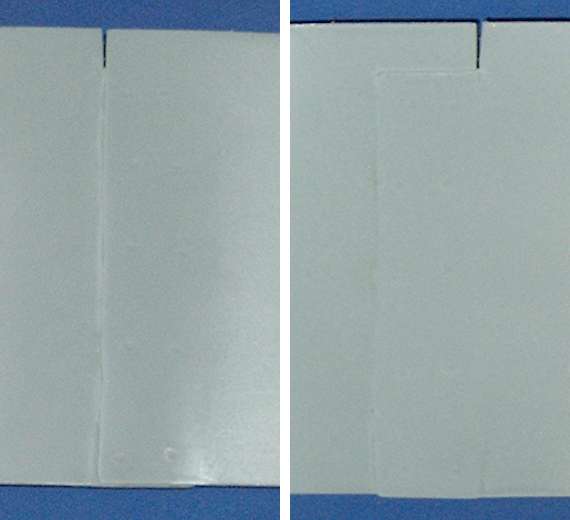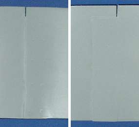 After spot welding I decided to remove all small burrs from the welds with the mini air sander to assure against paint break-through that might promote future corrosion. Spot welds can start to oxidize instantly after spot welding when the surface metal is still bright hot, even before the welding tips are separated from the work piece. So after deburring I sprayed a thin coat of the zinc-rich primer over the weld zone on both sides of the part. This is almost a trick picture with camouflage (at left). It left shows both sides of the same panel joint after deburring and painting. If you have keen eyes you may make out ten spot welds in two rows of five. Aside from the spots and paint, the assembled panel still looks much the same as before welding (a few pages back).