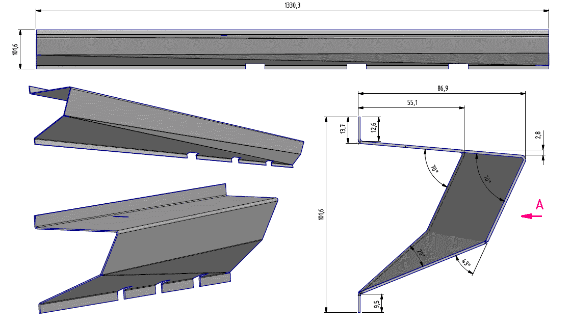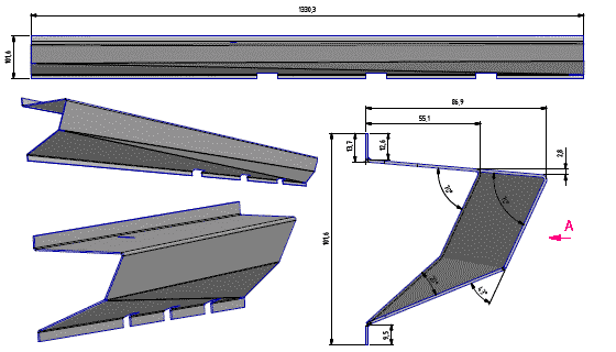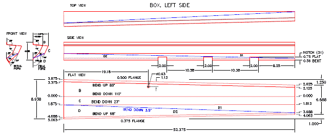 Now four years later we have a simpler point of view for forming this part. Well, at least a different point of view that might make it easier to understand. That troublesome surface "D" with progressive bends and a twist can be defined much simpler with a slight change of geometry to turn the progressive bends into simple bends and the twisted surface into two triangles. Starting with the prior drawing, divide surface "D" into two triangles D1 and D2 by drawing a new line from corner to corner as shown by the blue line in these drawings. (Click for larger images).