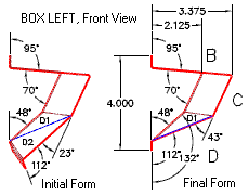 When bending up the part put a 3-1/2 degree bend on the new line. The flat blank before bending is the same, and the end view after final forming looks the same. Difference is the lower surface "D" is now slightly convex on the outboard side of the box, the previously twisted surface is now two flat triangles, and those pesky progressive bends are now magically simple bends.
