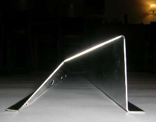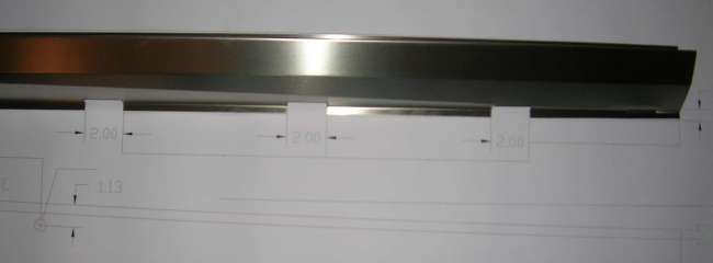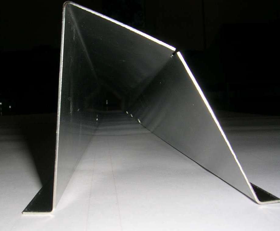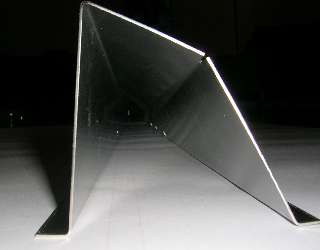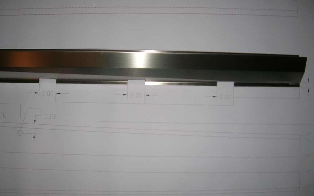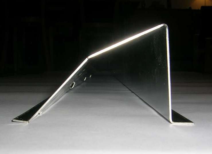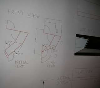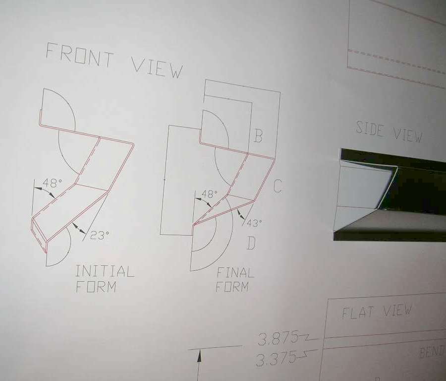 Following on from the prior page, this is what happens when an MGA owner in the middle of an MGA restoration is in charge of a modern stainless steel sheet metal fabrication shop. He and a CAD designer and a machine operator can tinker a little after hours in evenings and weekends, and a little modern magic can produce a precision part. This is the result of following up the the idea of a shallow angle bend to divide the twisted lower surface into two perfectly flat triangles. The prototype part shown here was produced on a production machine using the modern standard programming and numerical control automatic forming.
