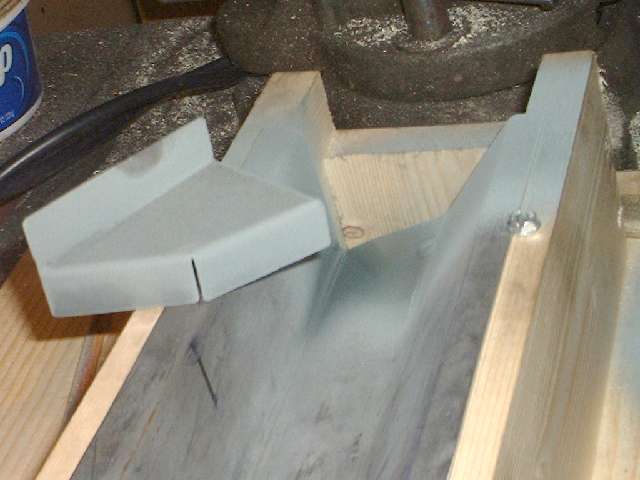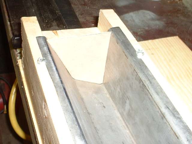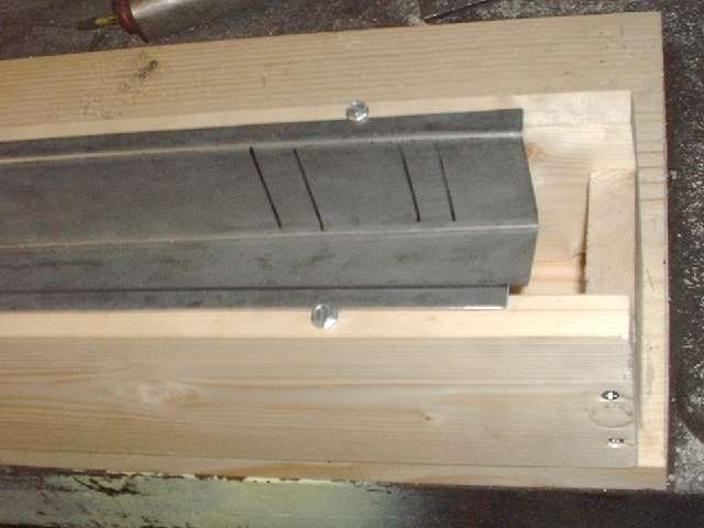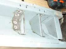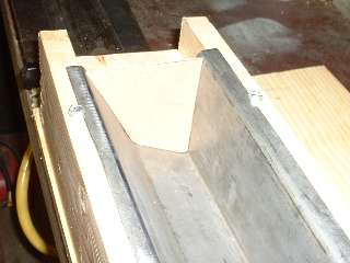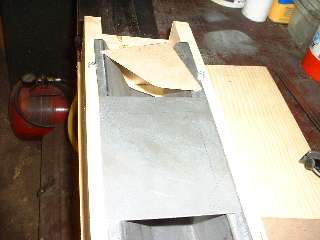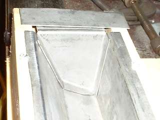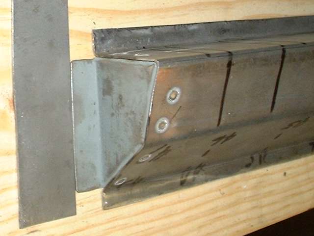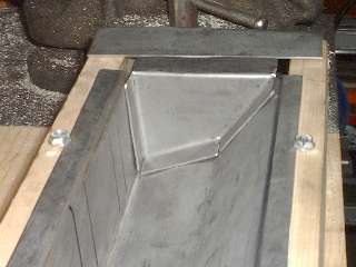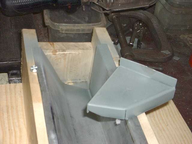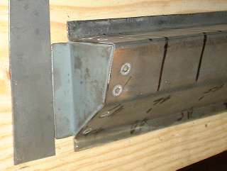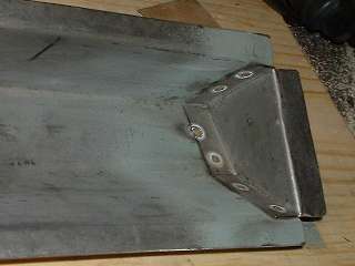 Picture above right shows the finished end plate. All of these bends were done in the vice with a hammer. I used a pair of short angle iron pieces to extend the vice jaws a bit to one side enabling me to make all three of the inward bends with no other spacer blocks. Technique here is to line up the innermost scribe line with the corner of the vice jaw (or angle iron in this case), clamp it tight, then hammer the flange over and down tight against the iron to make the zero radius bend. After three fairly quick bends the part dropped right into place with a good fit and little or no adjustment required. Holding the part in place, I then used a straightedge across the top of the wood fixture to scribe a line on the opposite side of the plate for location of the last bend. This bend will be exactly at the top of the wood fixture. After hammer forming the tight corner, notice the last flange lies in the same plane as box flanges. This is where it will weld onto the rear inner fender (mating to my new inner sill plate of course). (13 Feb 08 pm)