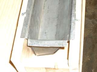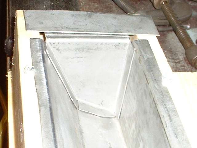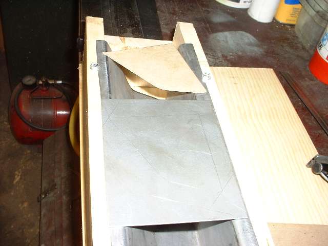 Picture below left shows a cardboard template cut to fit inside the box panel at the large end (front). It is thin cardboard from the back of a pad of writing paper, just hold it over the end of the panel, trace around the inside with a pencil, and cut it out with scissors. Picture below right shows the template with a sheet metal blank. I lay the template on the sheet and run a scribe around it to mark the panel size on the metal, then use a straight edge and scribe to mark the offset of the outer flange width all around. I cut out the blank using the hand held sheet metal shear, then notch the corners using the 3-inch cut-off grinder, and flatten and deburr the blank before bending.