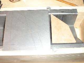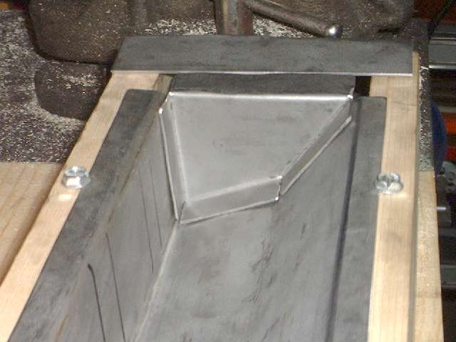 This session starts with a simple box fixture consisting of a pair of 1x4 boards on edge with 3-1/2-inch wide spacers at the ends. With the few flange head screws on top this gently holds the sill box panel with inner face up in a flat plane while I work on fitting the end plates and inner gussets. The black lines inside the top surface of the sill box mark the location for the gussets that will be installed directly in line with the bottom flanges on the door posts.
