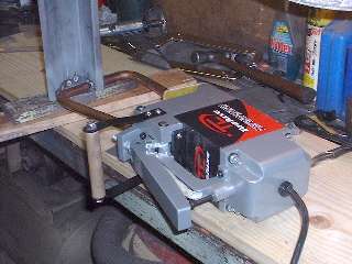 Okay, here's the drill for warp-free spot welding. The general idea is that the only physical force on the work piece or the spot welder tongs should be the pinch force, and no gravity load or twist or out of plane push. Keep in mind it requires at least one hand to squeeze and trigger the spot welder, and it weights 35 pounds. That leaves me with only one hand to hold anything else. So I lay the spot welder on its side on the workbench, and set the work piece on some wood blocks to fixture it in position within the tongs of the welder. There is also a sheet metal shim under the front end of the welder body for fine adjustment of the height at the business end. The sides of the copper tongs should not touch anything metal, as it could cause a short circuit of the high current with "surprising" results (to put it mildly). Only the conical tips of the tongs should touch the work zone. Here my left hand can hold and align the work piece while my right hand can squeeze the big lever and press the trigger on the welder. What you don't see in the picture is a couple of welding clamps that were holding the sheet metal bits together during the first few welds.