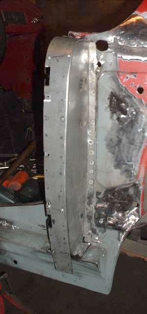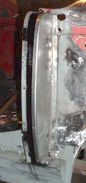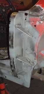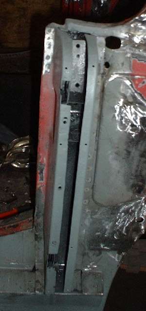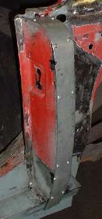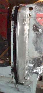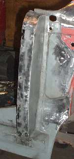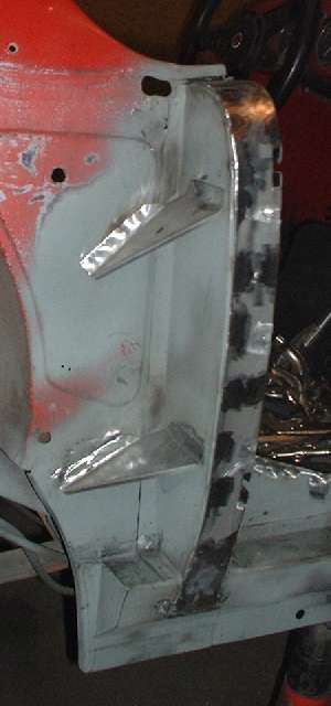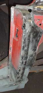 Remember the gussets I made back on page 11, and the B-post rear plates I made back on page 12? Well I finally get to install them here. The first photo below left shows the rear plate welded in place. After zinc primer and aligning and clamping the plate in place,