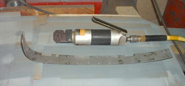 Now here is the finished closure plate with the plug welding holes punched. The picture above also shows the air tool used to punch the holes. This is a dual purpose tool with a flanging die near the end that will press an offset in the edge of sheet metal to provide a lap joint for welding. That function will most likely not be used during this project. The second slot from the end contains the 1/4-inch punch and die for making the plug welding holes. Held square against the edge of the sheet metal the tool will punch a 1/4-inch hole 5/16-inch from the edge. In this case I held the tool slightly askew to punch the holes only 1/4-inch from the edge. Photo on right above shows the closure plate coated with zinc paint on the inside surface, ready to be welded in place.