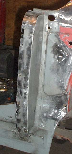 During initial welding the closure plate was held in place with all ten screws to be as secure and intimate as possible for plug welding. Then the screws were removed, and the screw holes were also plug welded. The bottom end of the plate was then hammered a bit to be flush against the sill box panel for plug welding there. All plug welds were then ground flush ready for painting. The final picture shows the triangular gussets installed (with zinc paint in the joints). The top one was spot welded to the inner body while the other three flanges were plug welded and ground flush. About this time a friend came for a visit, and we had a jolly good time wailing on the sill and pillars with a 2-pound dead blow hammer just to demonstrate how solid this construction is. (7 Mar 08)