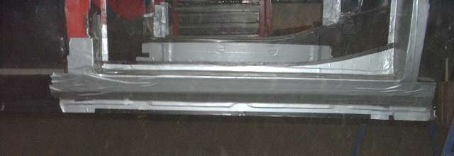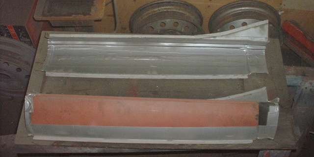 In the photos above a sharp eye may notice a slight twist in the top surface of the rocker panels. They seem to have 8 degree side slope at front and 12 degree side slope at back. This is a function of the parts being narrower at the back while maintaining constant height on the top and bottom flanges and also constant height of the stepped shoulder that mates with the bottom edge of the door.
