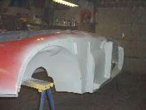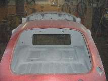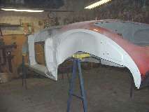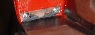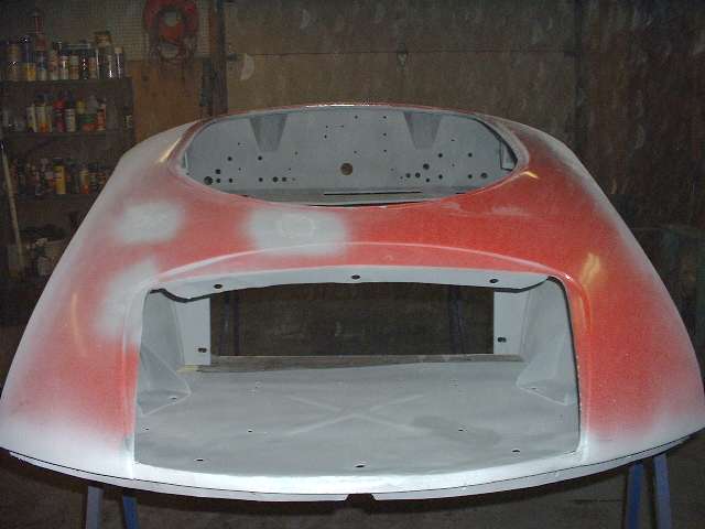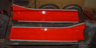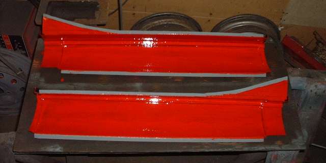 Before the tape was removed, the inboard side of the flanges were sprayed with the zinc-rich primer (2 light coats) in preparation for spot welding. Then the masking tape was removed, and inside of the panel was brush painted with finish coat red, being careful not to paint over the Zinc coated weld zone. This is partly due to my sense of humor showing through, with a slight ulterior motive. End result is picture above right.