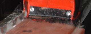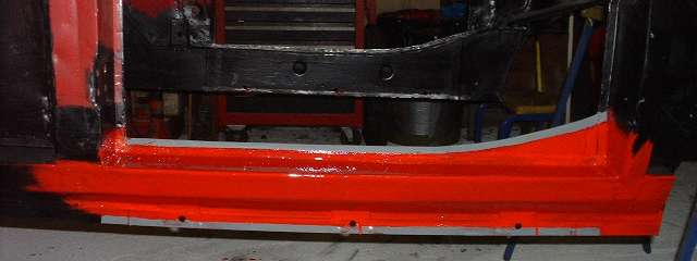 Next came similar preparation for the body sills. Area around the top and bottom flanges at the door opening was masked with Duck Tape, leaving about 1/2-inch of the black painted metal exposed inside and outside (photos above). The exposed flanges were sandblasted to remove the paint to bare metal, and the outboard side of the flanges were sprayed with the zinc paint in preparation for spot welding. Then the tape was removed, and the outboard side of the sills were brush painted finish coat red, being careful not to cover the zinc paint in the weld zones (photos below). This was not as much extra effort as you might think, since the masking and sand blasting was being done for spot welding anyway. It didn't take very long to brush paint the surfaces that would ultimately be hidden inside the rocker panels. Having fiddled with the sand blaster to remove the paint for this little job, I'm pretty sure it could have been done easier with the mini disc sander. (22 Mar 08)
