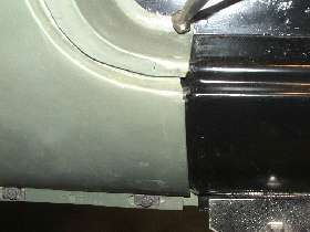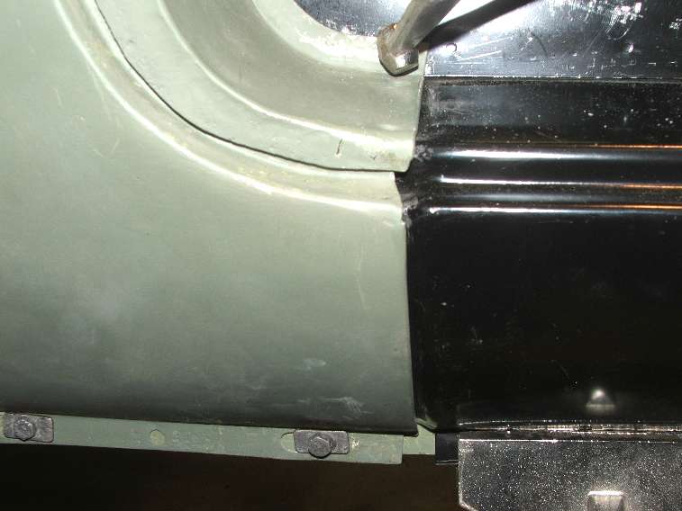 In these pictures you can see where the original bend line was in relation to the new bend, as the original line is still visible below the new bend. At rear end (left photo) the bend is moved up about 1/2-inch. At front end (right photo) the bend is moved up about 5/16-inch. The rear of the rocker panel and the rear fender need to be raised about 1/8-inch to be flush at bottom of the body sill. The flange was trimmed a bit too narrow at front after reforming, but this is no problem since the lower body trim strip will hide it.